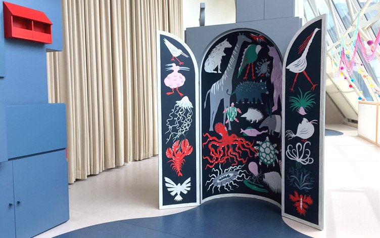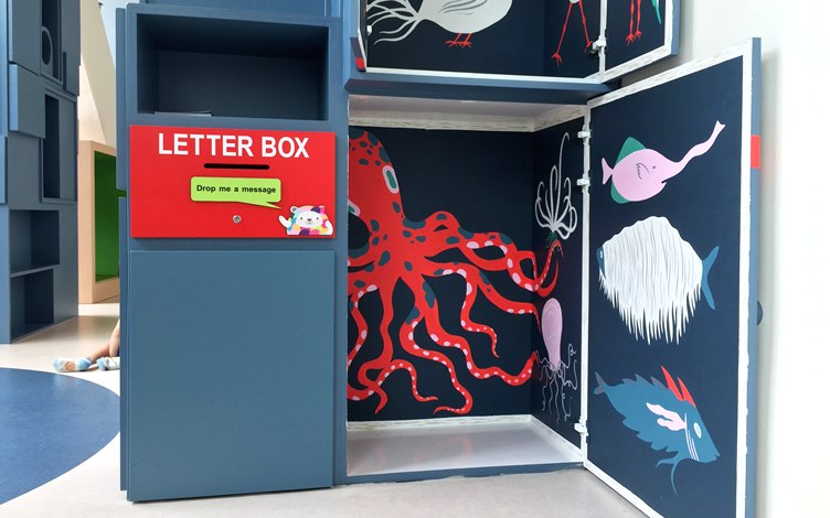 Artist Tan Zi Xi or MessyMsxi, an illustrator of children’s picture books, had been commissioned by Esplanade to paint the inside of the cabinets after it was observed that children couldn’t stop opening them. Previously, the cabinets were undecorated and mostly used for storage. The brief for the artwork was a simple one: anything which would spark a child’s curiosity.