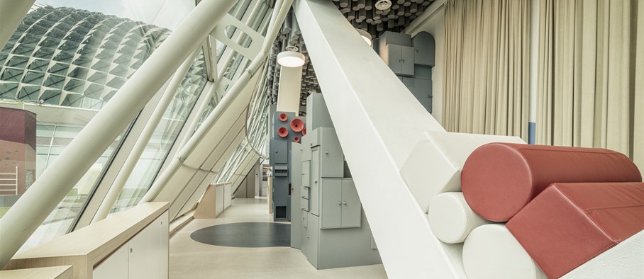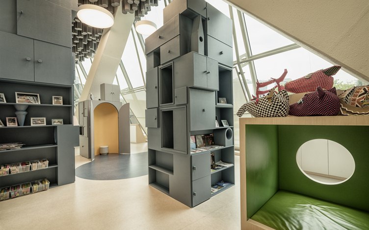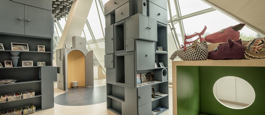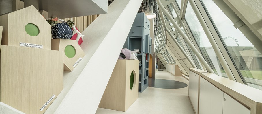 At the end of the escalator and up a flight of steps, we entered PIP’s PLAYbox, Esplanade’s free activity area for children. This long 187.3 sqm room with a high ceiling was formerly a foyer space for the Theatre Studio, where the arts centre stages theatre productions for children, adapted from children’s books by Singapore authors. Families watching these plays or just wandering through Esplanade can now pop by PIP’s PLAYbox, designed by Lekker Architects with sloping, floor-to-ceiling windows that let in plenty of light, the odd corners of the space transformed into secret nooks and crannies.